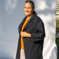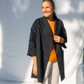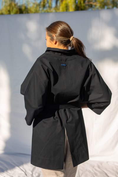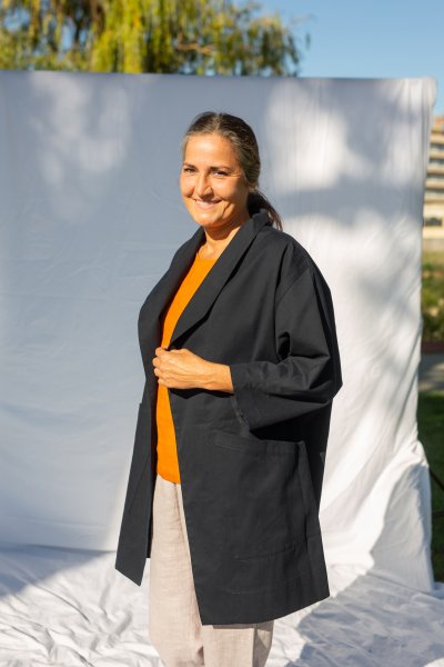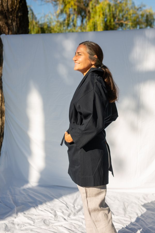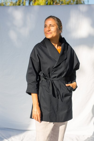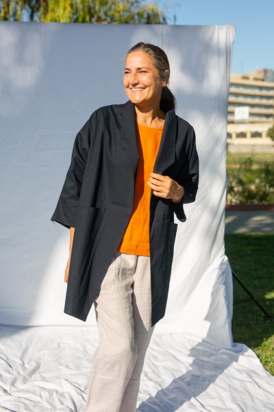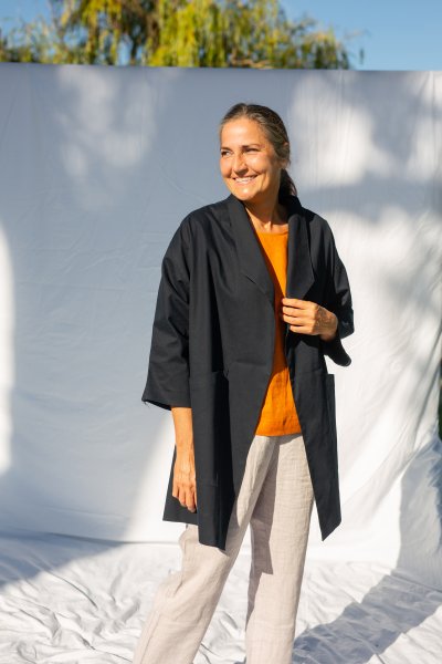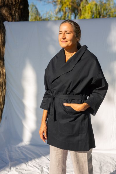 The USA cardigan will win you over in a single millisecond and will provide passers-by with a wow effect at first sight. It is especially suitable for spring and autumn as a top layer and looks great with protruding sleeves of undergarments. It can be interestingly complemented with brooches from our collection, or a belt in the same or contrasting color. The color palette from which we can sew your coat is based on the availability of cotton fabric in the showroom.