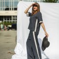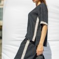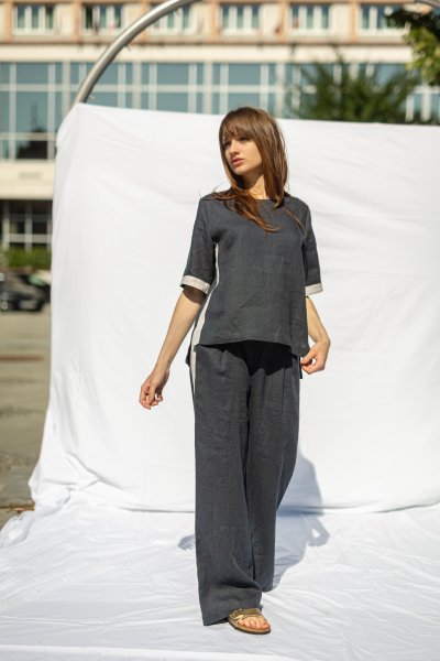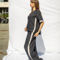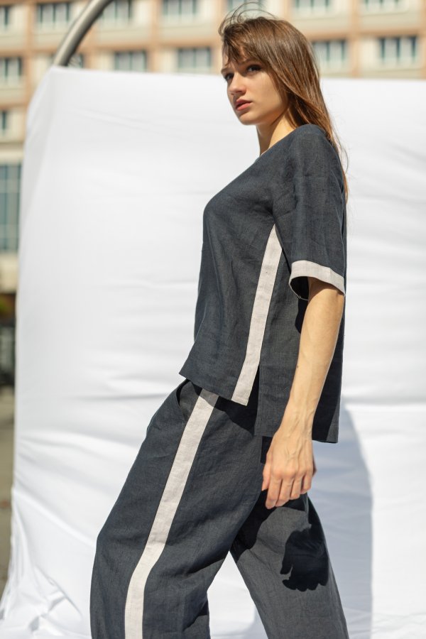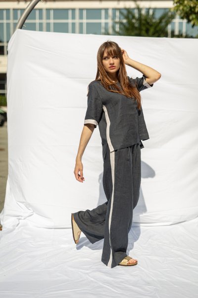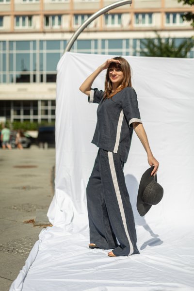 The trousers are based on our popular Sofist model, but a wider contrasting stripe along the entire side seam gives them a modern character. The waist is cut in the same way as the Sofist trousers: they have a straight, solid waistband in the front, which adds elegance, and an elastic band at the back for a comfortable fit. They are easy to combine with all our tops, but especially with the Cali T-shirt, which has a waistband in the same color and thus forms its continuation. Please write to us in the notes what color of the side stripe you prefer.
