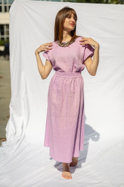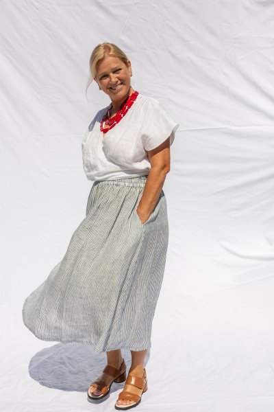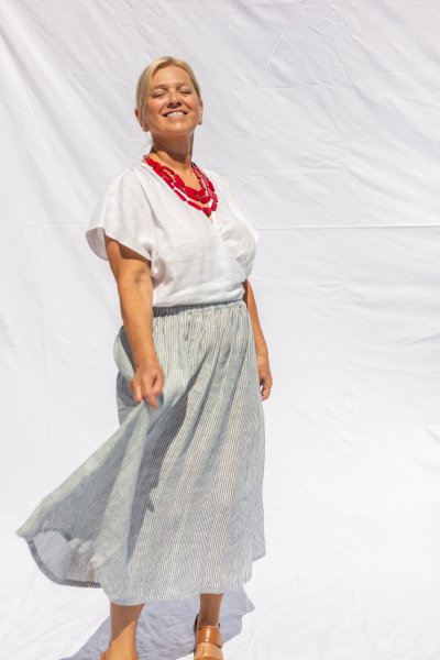 Sukňa Hvar vytvára ženský a nenútený vzhľad v kombinácii s tričkom alebo tielkom a akýmikoľvek vašimi obľúbenými opätkami, teniskami, drevákmi, alebo sandálmi. Hvar je prímorské mesto, kde od mora fúka vietor a počas sviežeho dňa rozhojdá vašu sukňu ako plachtu... Do poznámky nám prosím napíšte, ak si prajete sukňu v niektorej zo vzorovaných ľanových látok ako je aj pásik na fotke, máme ich v limitovaných sériách.